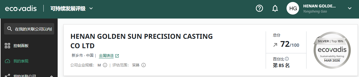 近日,國際可持續(xù)發(fā)展評(píng)級(jí)領(lǐng)域傳來喜訊:河南省金太陽精密鑄業(yè)股份有限公司在最新的EcoVadis評(píng)估中斬獲72分,成功從2025年的銅牌(63分)躍升至銀牌級(jí)別,排名進(jìn)入全球受評(píng)企業(yè)前15%。這一跨越式的進(jìn)步,不僅標(biāo)志著金太陽鑄業(yè)在可持續(xù)發(fā)展管理上的持續(xù)進(jìn)步,更以其在高端機(jī)床鑄件領(lǐng)域的深耕細(xì)作,再次鞏固了其行業(yè)“排頭兵”的地位。