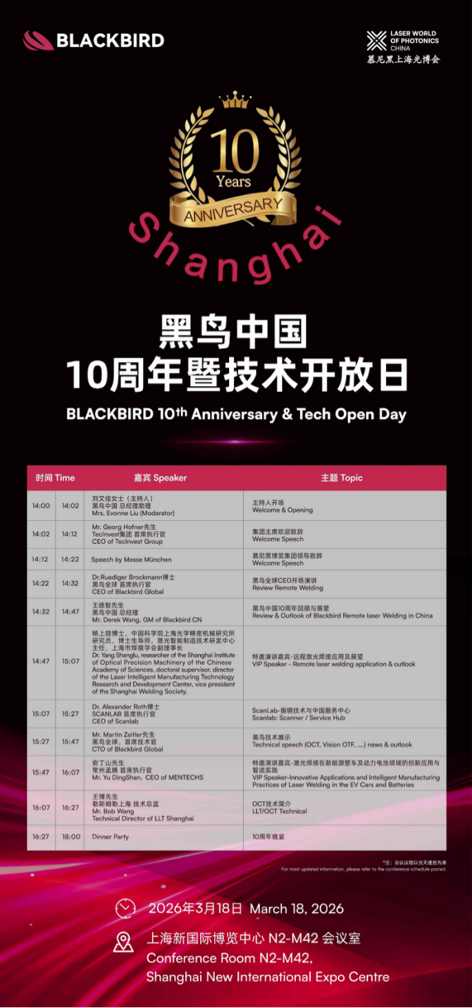 值此光博會(huì)之際,黑鳥(niǎo)中國(guó)將隆重舉辦10周年慶典暨技術(shù)開(kāi)放日。本次活動(dòng)特邀產(chǎn)學(xué)研界重磅嘉賓聯(lián)袂開(kāi)講,帶來(lái)激光智能制造的前沿技術(shù)分享。