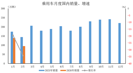 2026年2月,乘用車國內(nèi)銷量95萬輛,環(huán)比下降32.1%,同比下降34.2%。