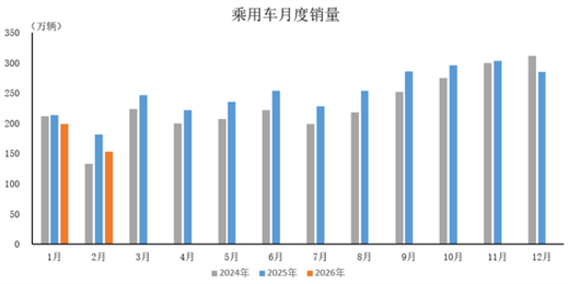 2026年1-2月,乘用車國內(nèi)銷量235萬輛,同比下降26.2%。