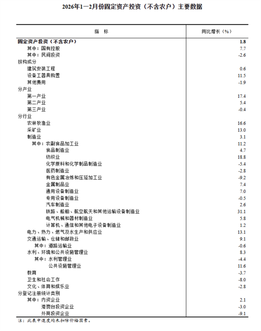 【機(jī)床商務(wù)網(wǎng)欄目 市場分析】1—2月份,全國固定資產(chǎn)投資(不含農(nóng)戶)52721億元,同比增長1.8%(按可比口徑計(jì)算,詳見附注7)。其中,民間固定資產(chǎn)投資同比下降2.6%。從環(huán)比看,2月份固定資產(chǎn)投資(不含農(nóng)戶)增長0.39%。