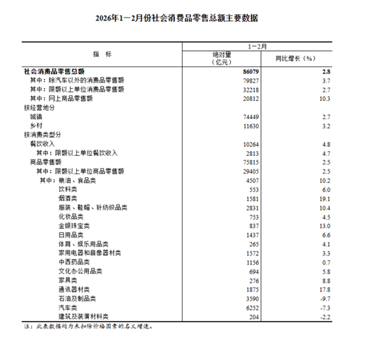 摘要—2月份,社會消費品零售總額86079億元,同比增長2.8%。其中,除汽車以外的消費品零售額79827億元,增長3.7%。