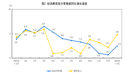 按消費類型分,1—2月份,商品零售額75815億元,同比增長2.5%;餐飲收入10264億元,增長4.8%。