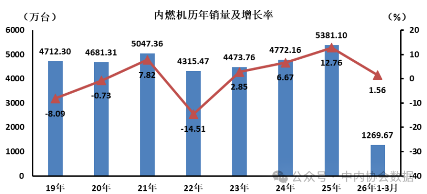 據(jù)中國內(nèi)燃機(jī)工業(yè)協(xié)會(huì)統(tǒng)計(jì)分析,2026年3月,內(nèi)燃機(jī)行業(yè)銷量500.48萬臺(tái),環(huán)比增長(zhǎng)69.83%,同比增長(zhǎng)3.45%;1-3月累計(jì)銷量1269.67萬臺(tái),同比增長(zhǎng)1.56%。