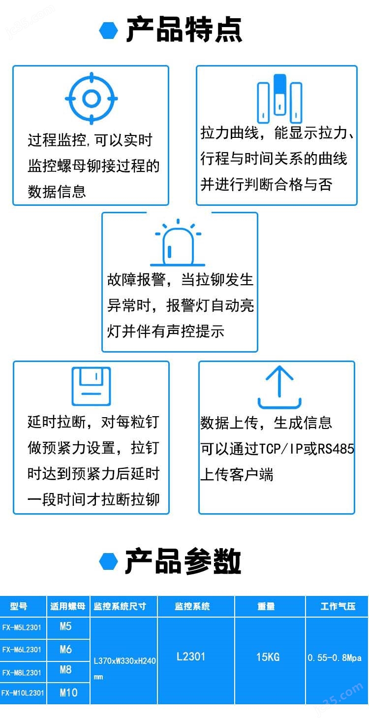 其工作原理簡潔高效:通過接入工業(yè)氣源(0.5-0.8MPa),驅(qū)動內(nèi)部氣缸帶動拉鉚桿伸縮,將拉鉚螺母壓入預(yù)制孔后,拉鉚桿收緊螺母形成鼓包,使螺母與板料緊密咬合,最終切斷多余部分,完成一次性牢固連接,全程無需焊接或打孔,避免損傷工件。