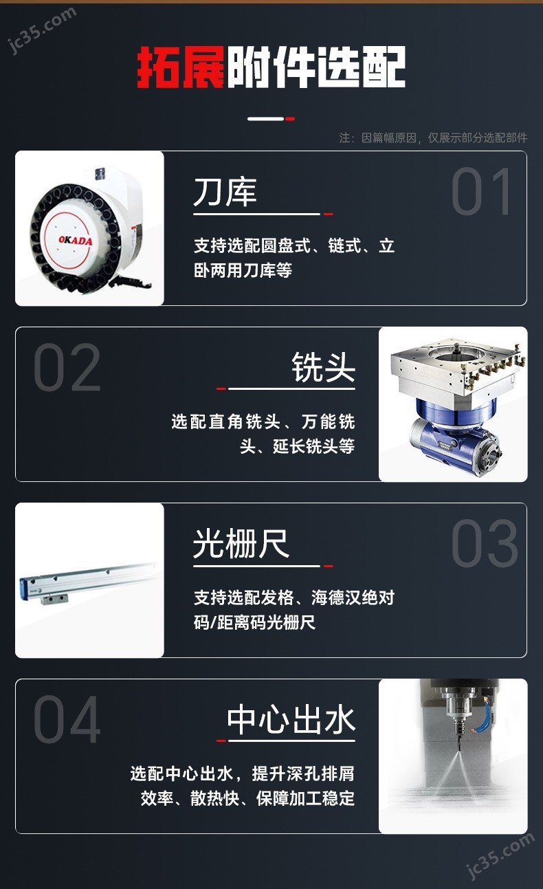 可選直角銑頭、萬向銑頭、延伸銑頭、全自動銑頭等附件頭;